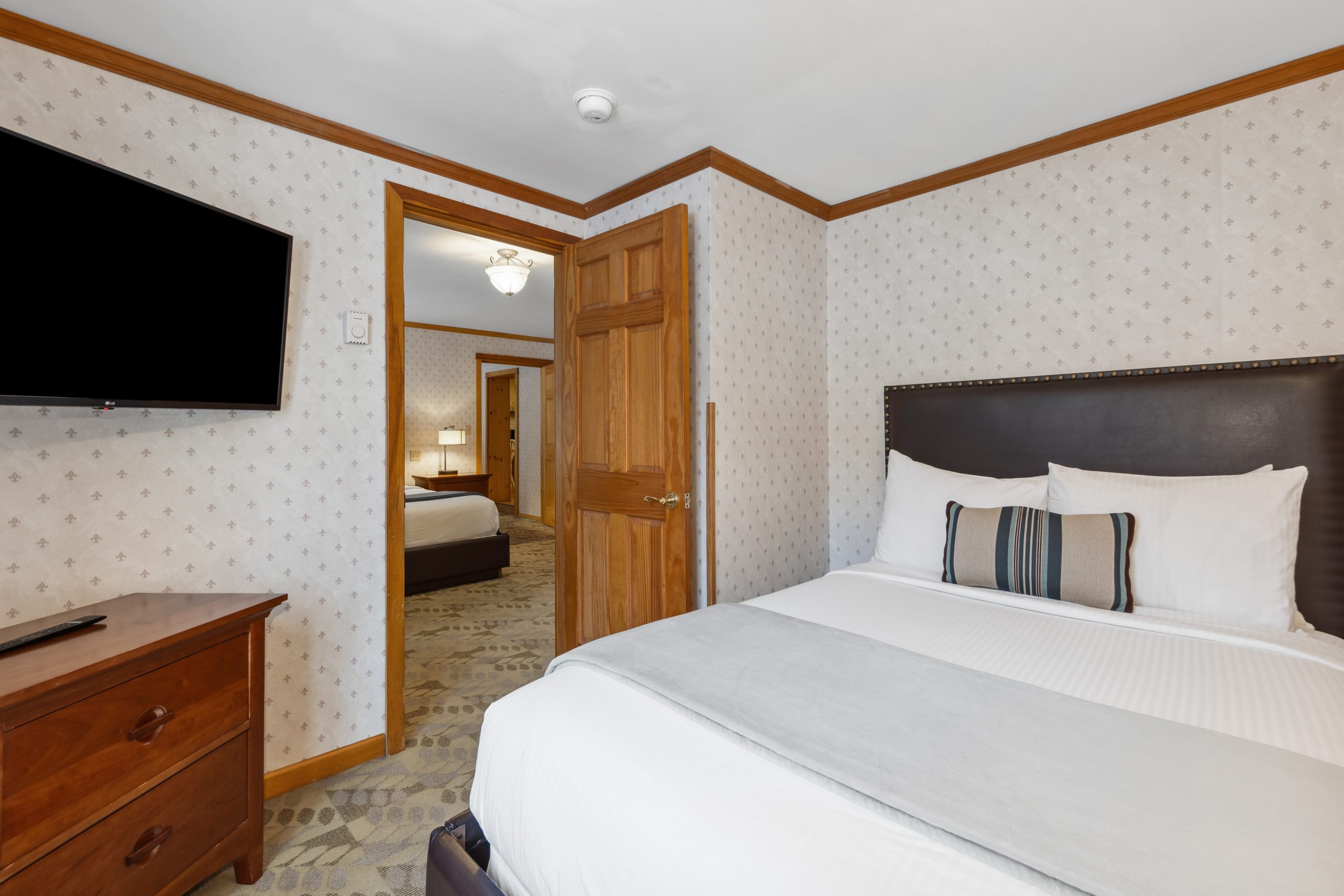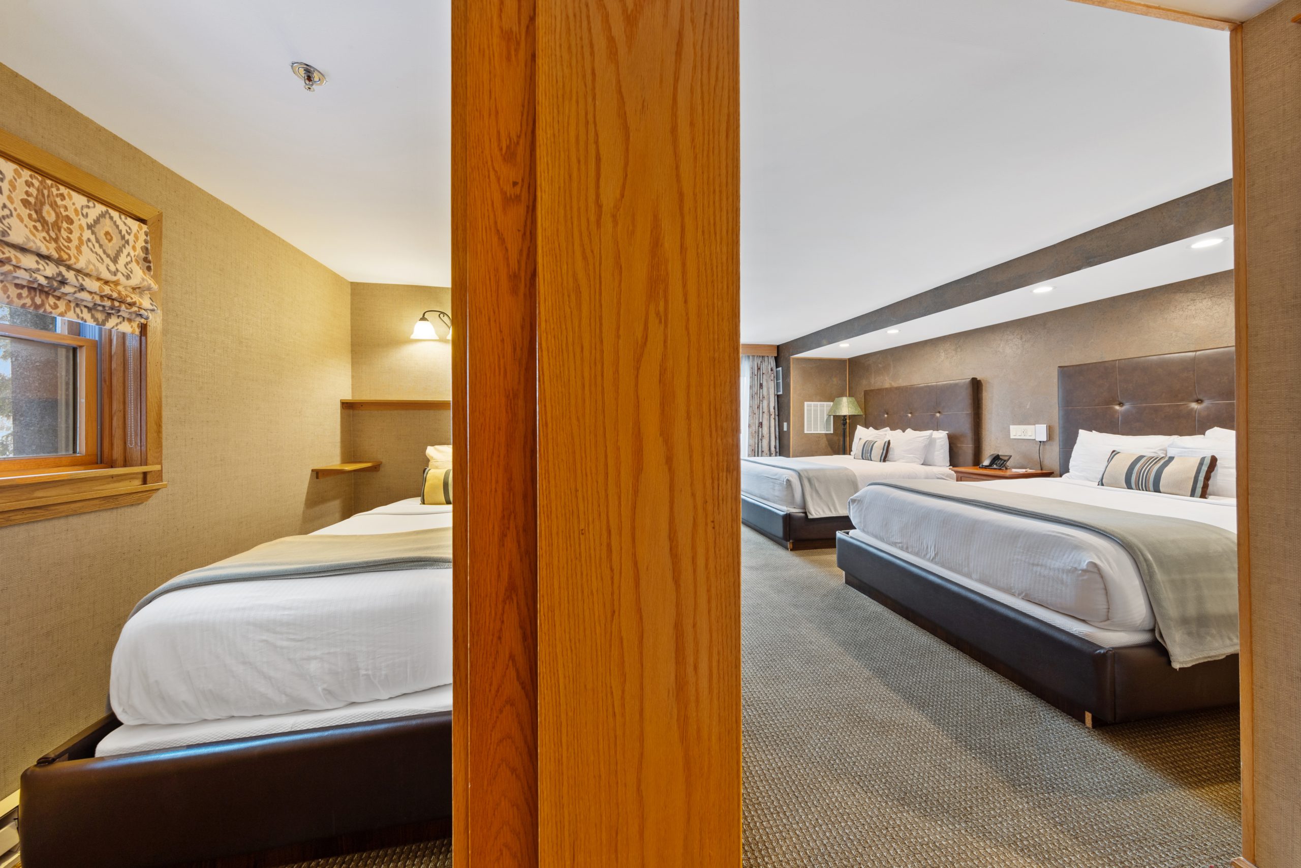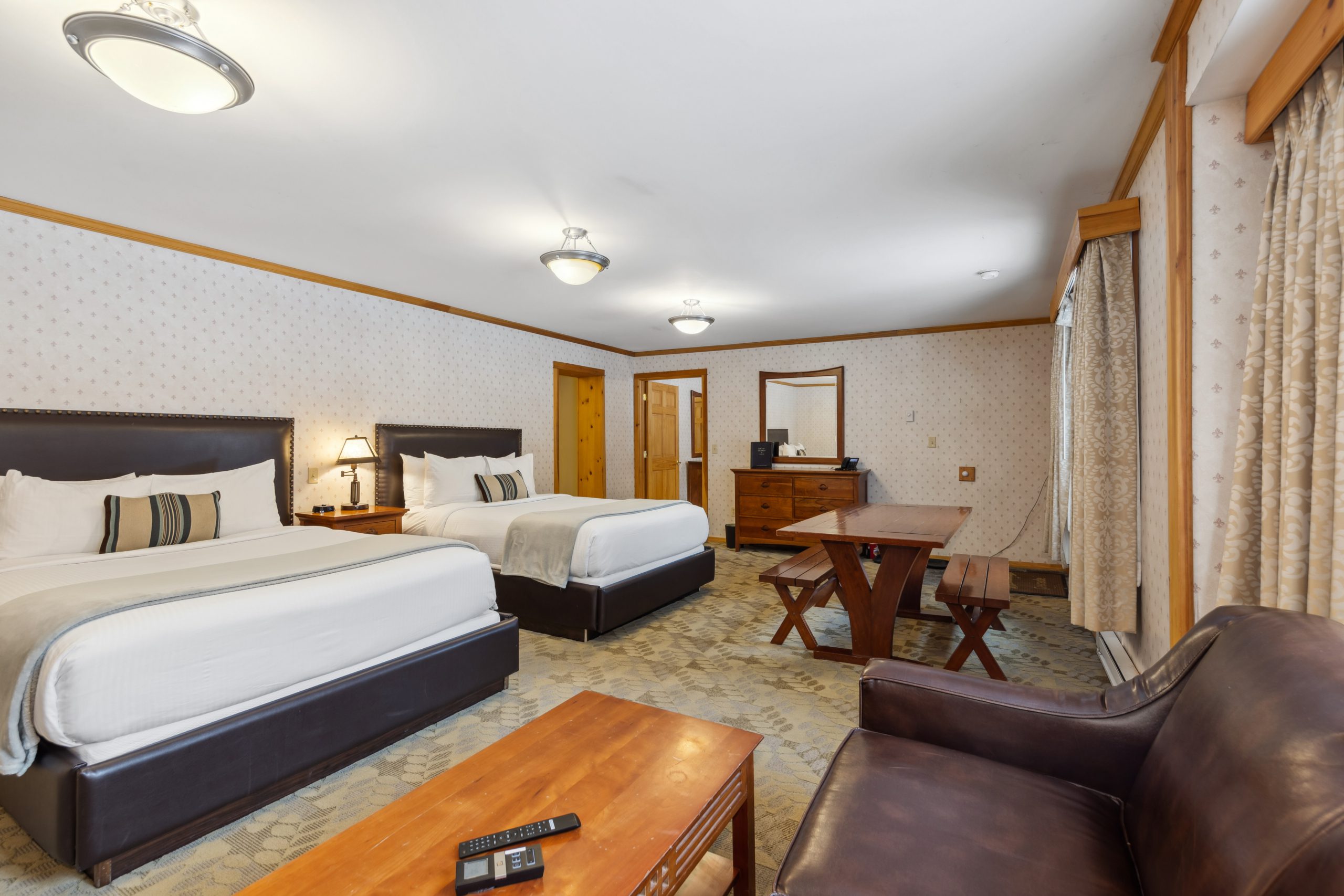 A favorite of many guests, Morningside is a spacious two-bedroom suite with a small kitchenette, two baths & a private entrance off of the Alpine Mall. Enjoy your morning coffee in the breakfast nook as you gaze out your picture window at Whiteface Mountain & the Sentinel Range. Morningside includes one king bedroom with a flat-screen TV & a full luxury bath with a body massage, and rain shower head. The second bedroom has two queen-size beds, a comfortable seating area, an oversized whirlpool tub & a separate glassed-in shower in the bath.