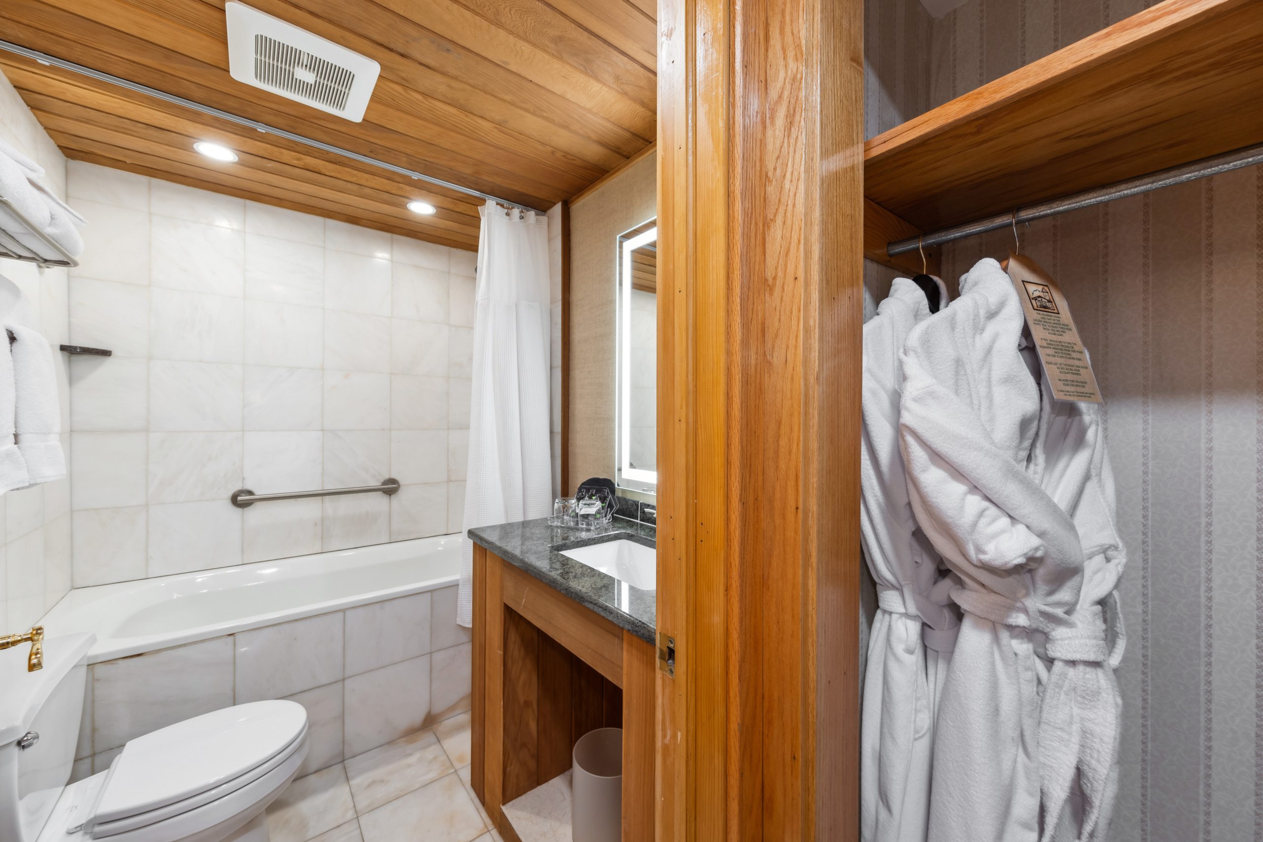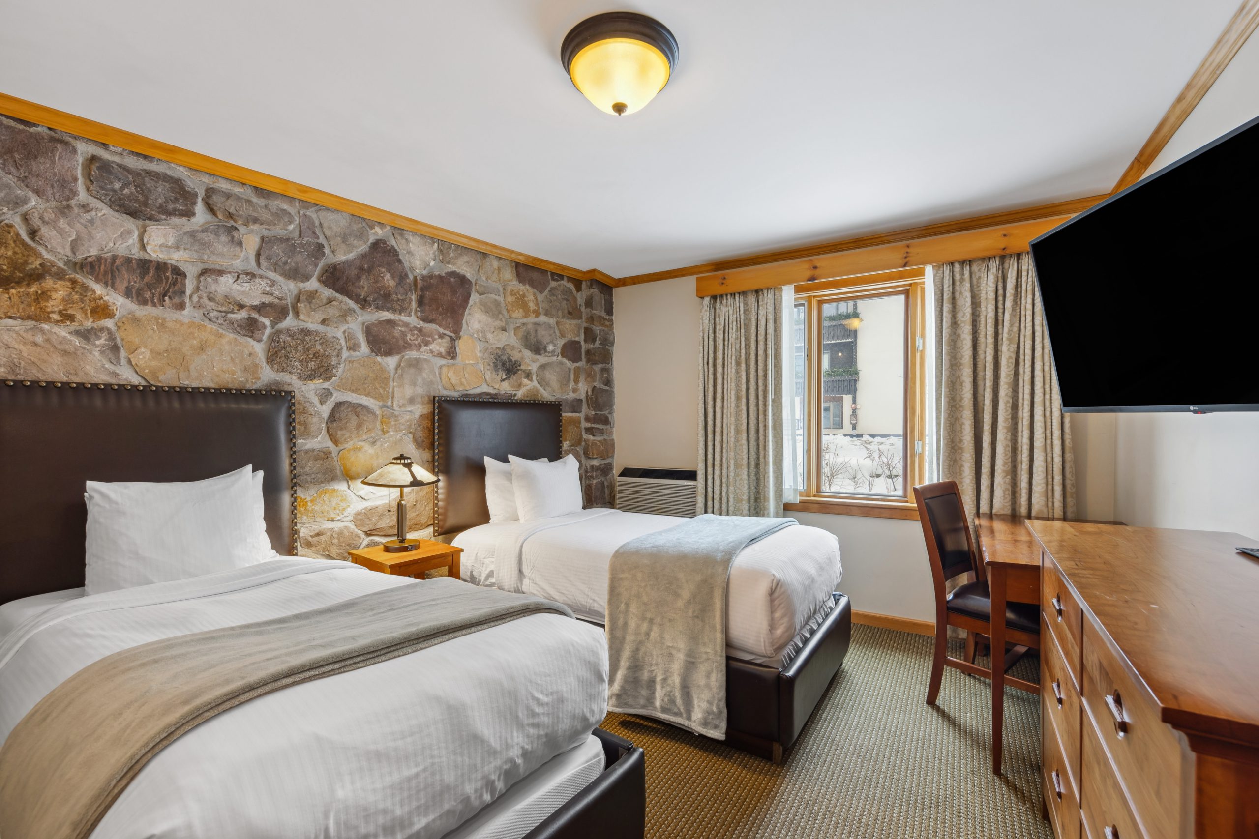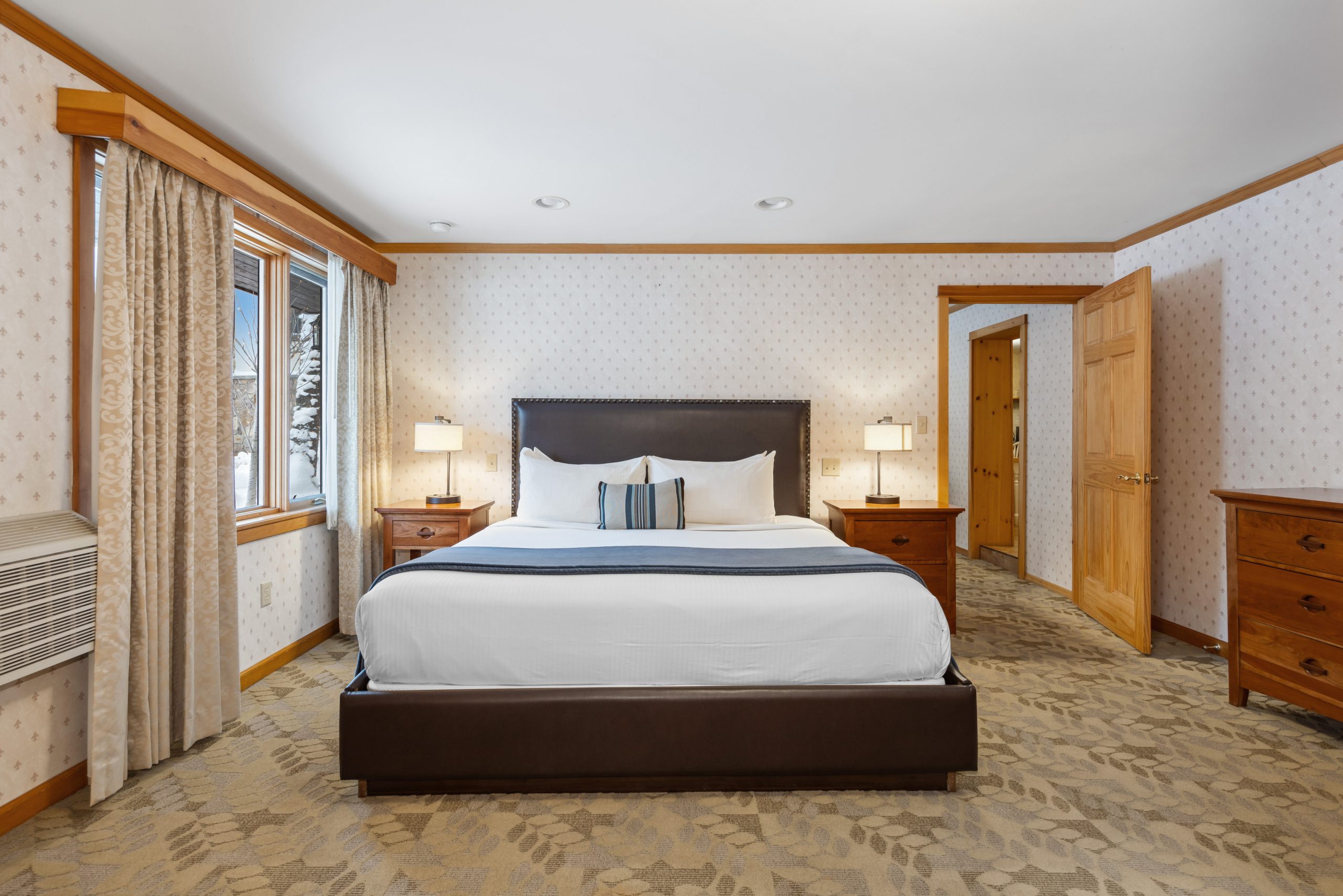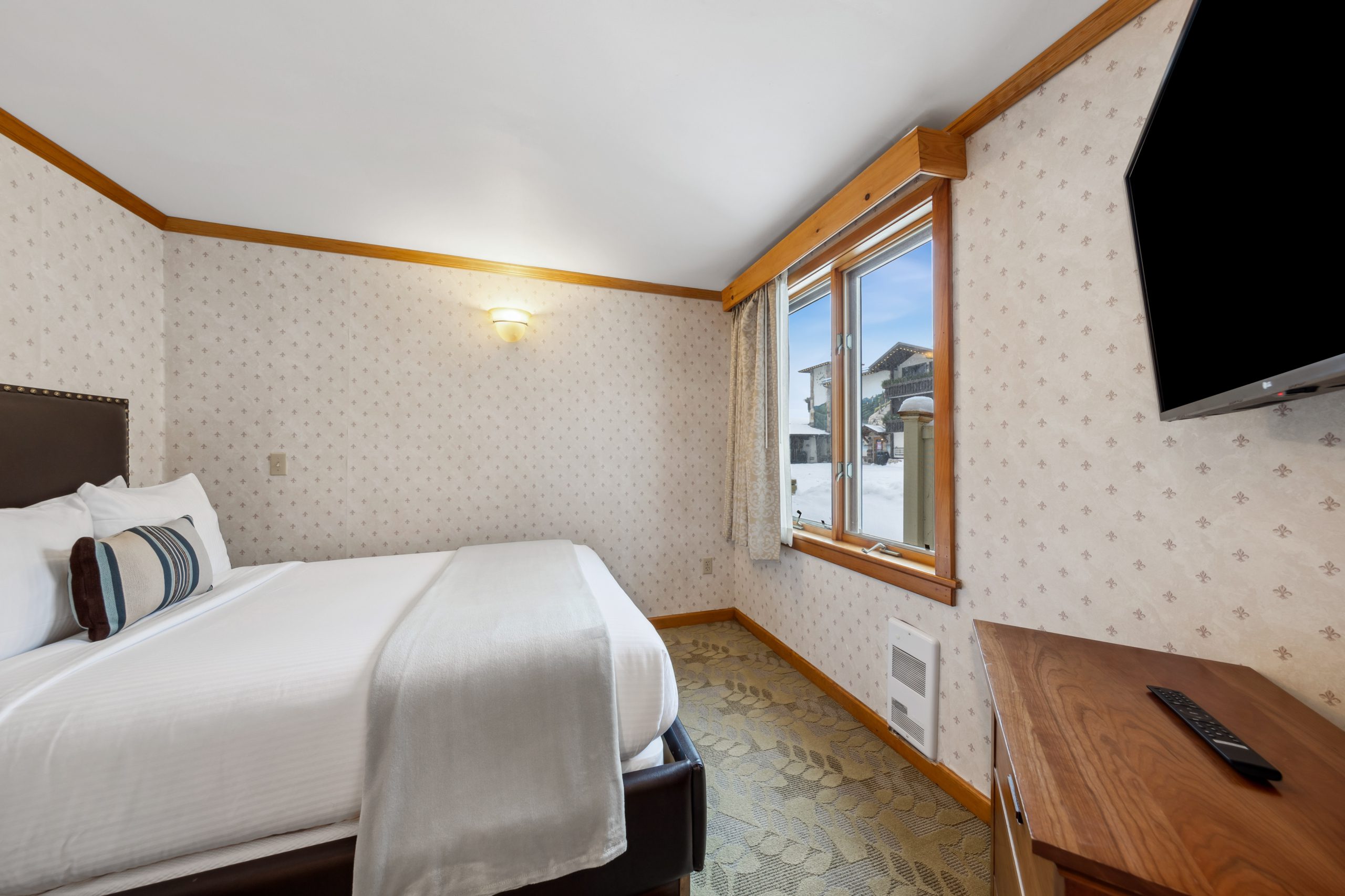 A favorite of many guests, Morningside is a spacious two-bedroom suite with a small kitchenette, two baths & a private entrance off of the Alpine Mall. Enjoy your morning coffee in the breakfast nook as you gaze out your picture window at Whiteface Mountain & the Sentinel Range. Morningside includes one king bedroom with a flat-screen TV & a full luxury bath with a body massage, and rain shower head. The second bedroom has two queen-size beds, a comfortable seating area, an oversized whirlpool tub & a separate glassed-in shower in the bath.