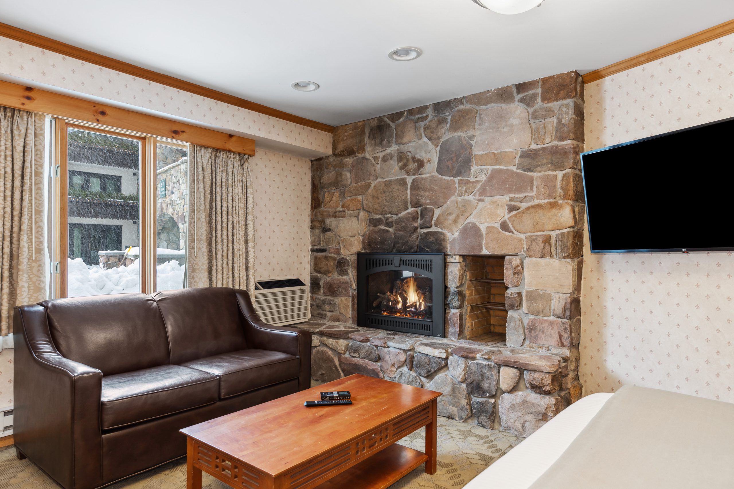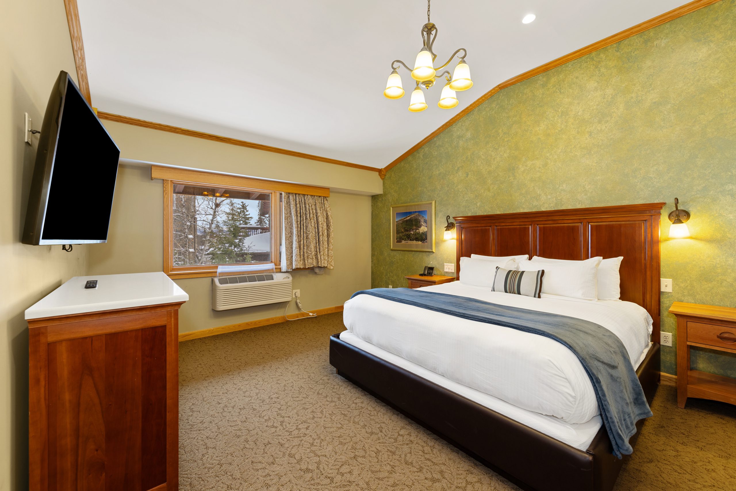 The open and airy Tabletop Suite is reminiscent of an apartment. The spacious living room features a flat-screen TV and a cozy sitting area with a pullout loveseat. The kitchenette stretches into the living room, giving it a very open-concept feel. The kitchen has a mid-size refrigerator, stovetop, microwave, sink & Keurig K-Cup single-cup coffee brewer. The bedroom features a King-sized bed and a flat-screen TV while the bathroom has a jetted whirlpool tub and glassed-in shower. This room is located in the West Wing of the hotel. The balcony does not overlook Mirror Lake.