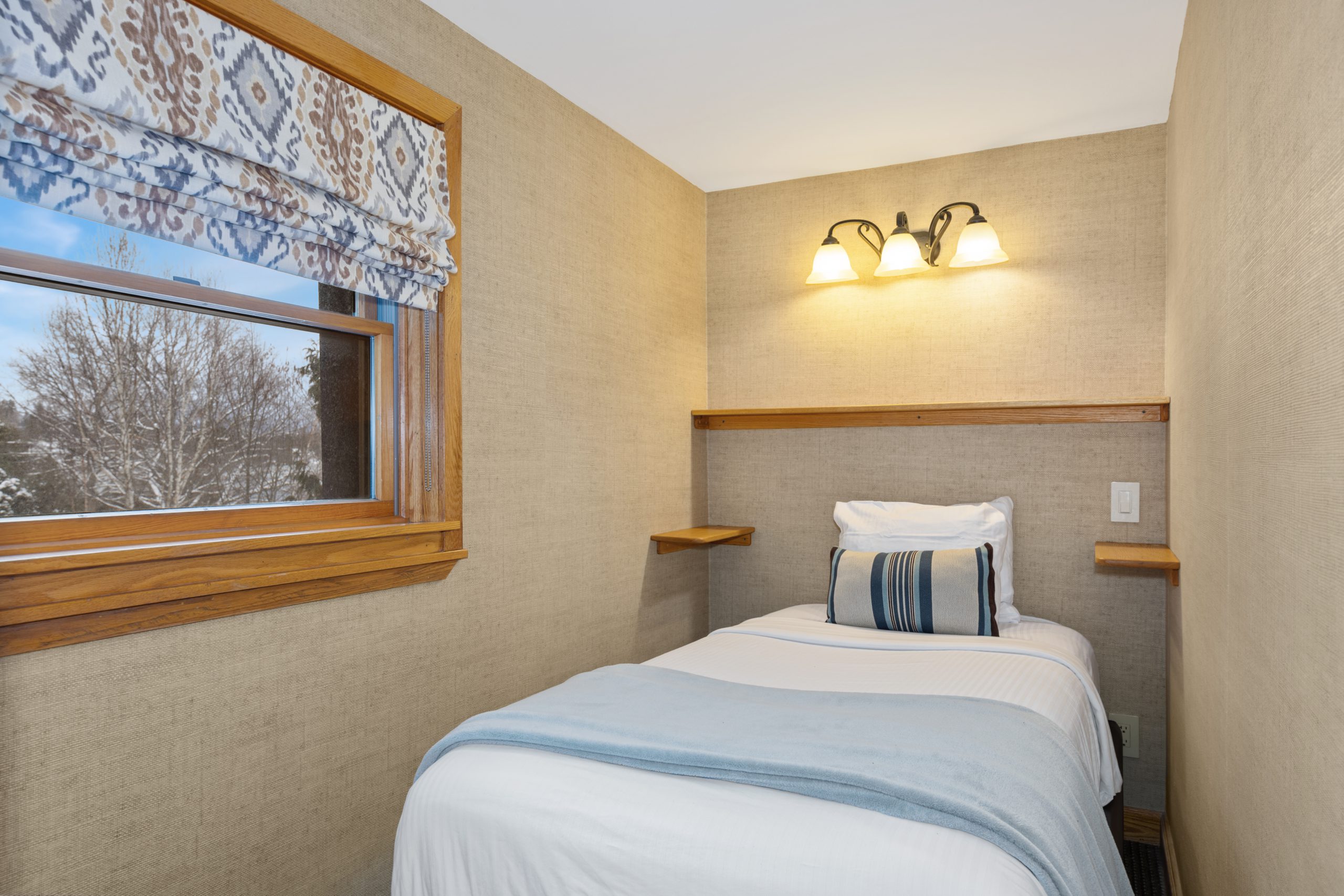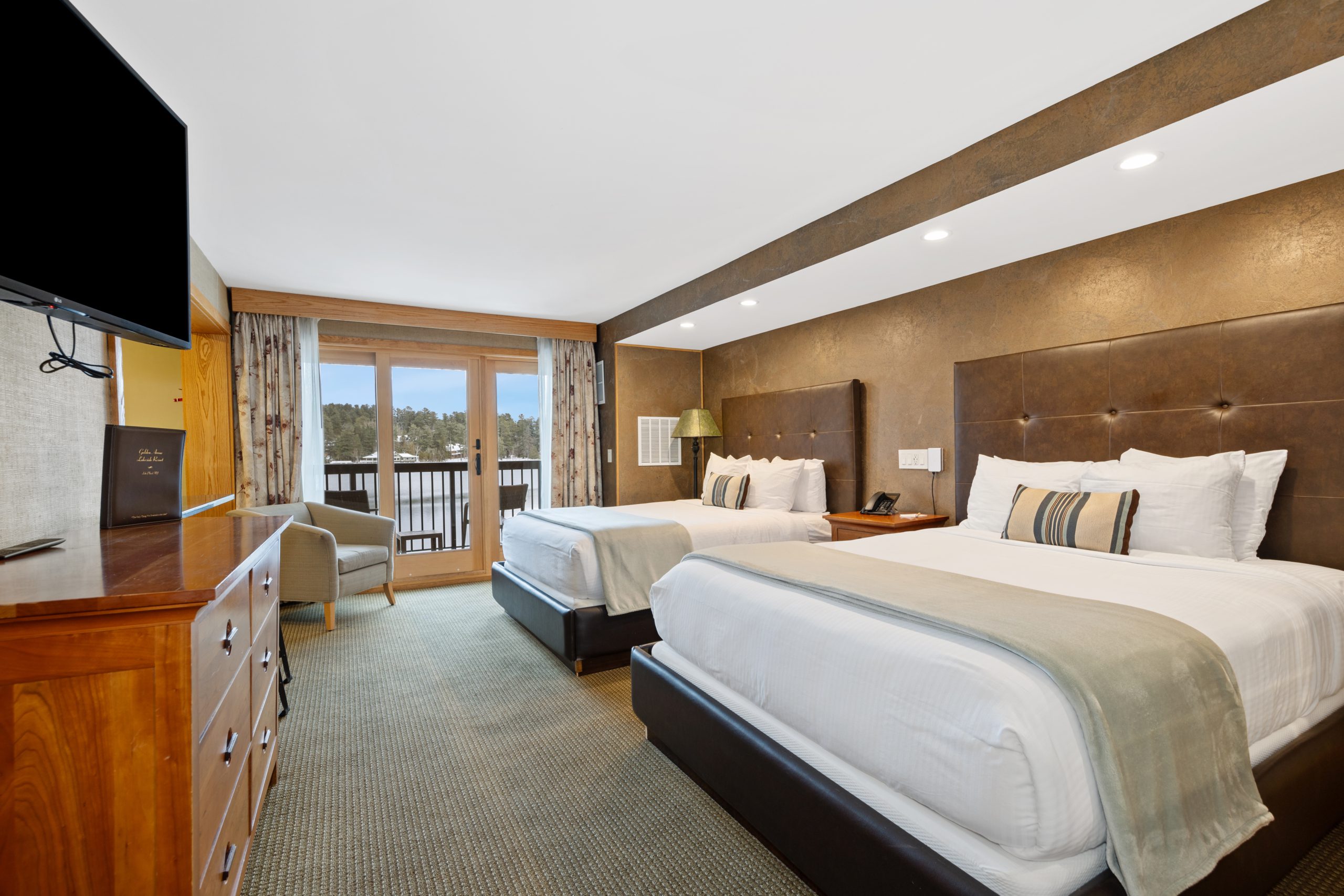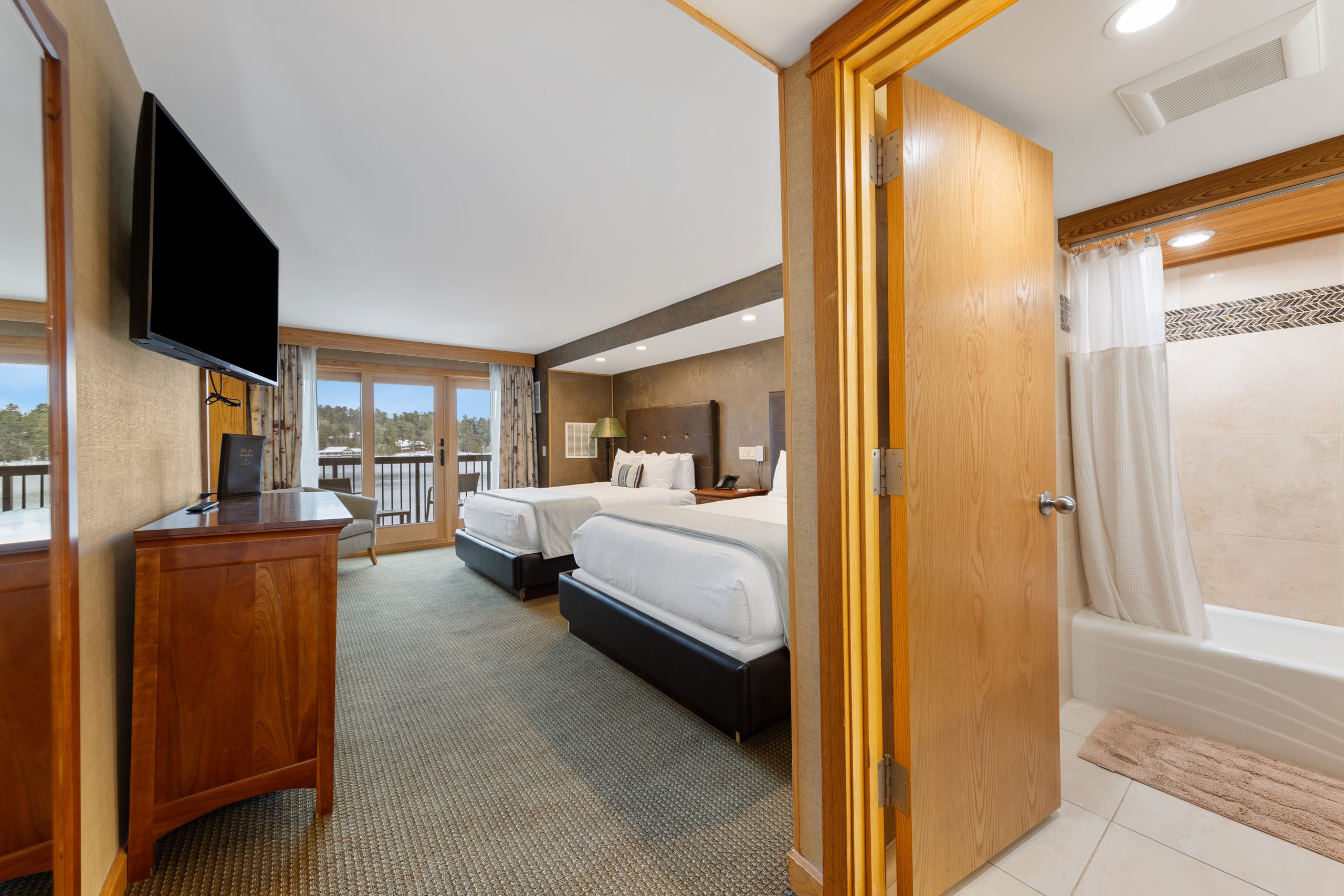 This kitchenette gives guests the flexibility to enjoy home-cooked meals at their leisure. A small kitchen equipped with a stovetop, mini refrigerator, microwave, sink, toaster, and breakfast nook that seats 4. This is linked to the bed chamber which has two queen beds, flat flat-screen TV & a private balcony overlooking Mirror Lake. A pocket door separates a small private sleeping alcove with an additional twin bed.